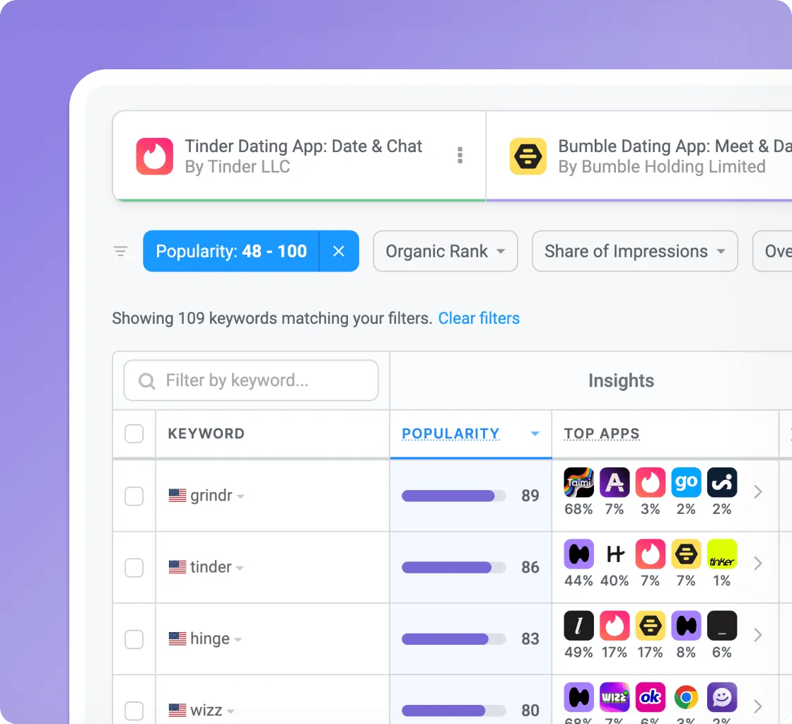 Reveal competitor keywords, optimize bids, and cut wasted spend with Apple Ads Intelligence to drive more downloads cost-effectively.