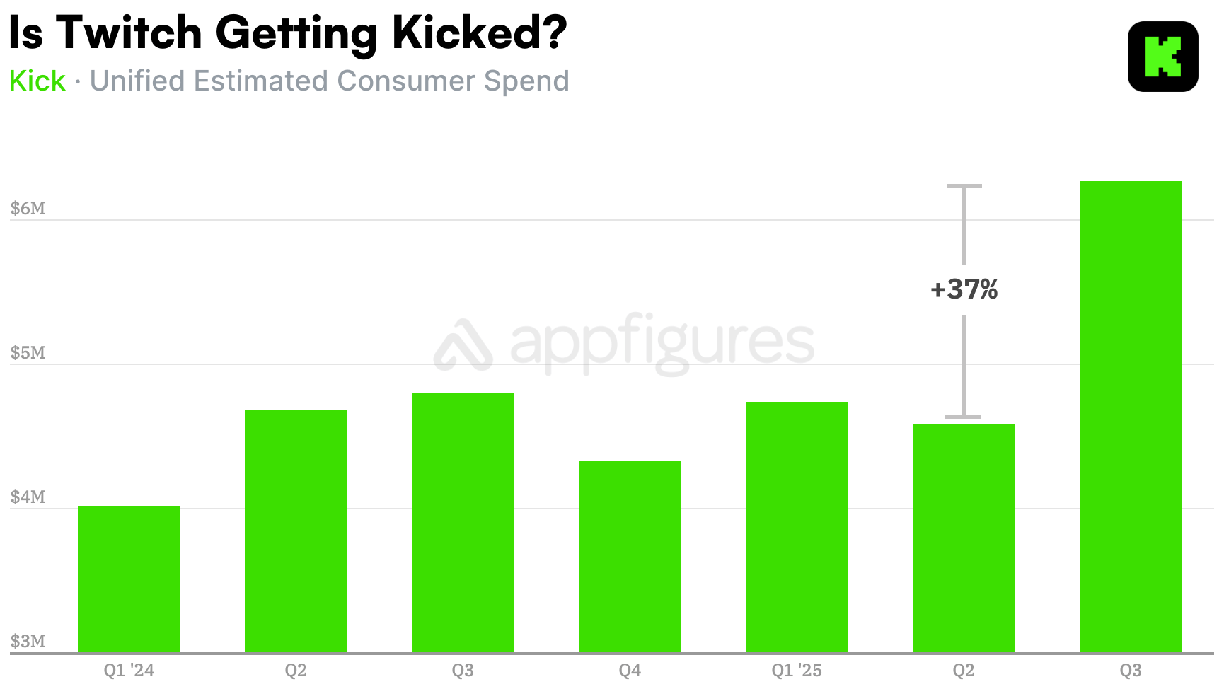 Kick's quarterly app revenue growth has been somewhat flat, ebbing and flowing around the $4.5M (pre-fees) since 2024, according to Appfigures Intelligence. However, things changed this summer as Kick has been gaining momentum thanks to the company making aggressive deals to get big names on the platform.