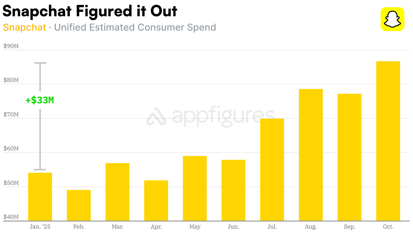 Looking at the revenue estimates for the entire year, October's gross revenue was $33M higher than January's haul. Last year, Snapchat also had a big October but not as big. Our intelligence shows the Oct vs Jan diff was $23M in 2024, a full $10M less.