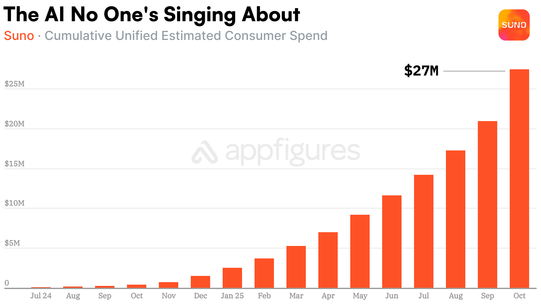 According to our estimates, users gave Suno $7M in October alone, more than double what it made just a few months earlier. That's the kind of acceleration that means Suno isn't just a gimmick.