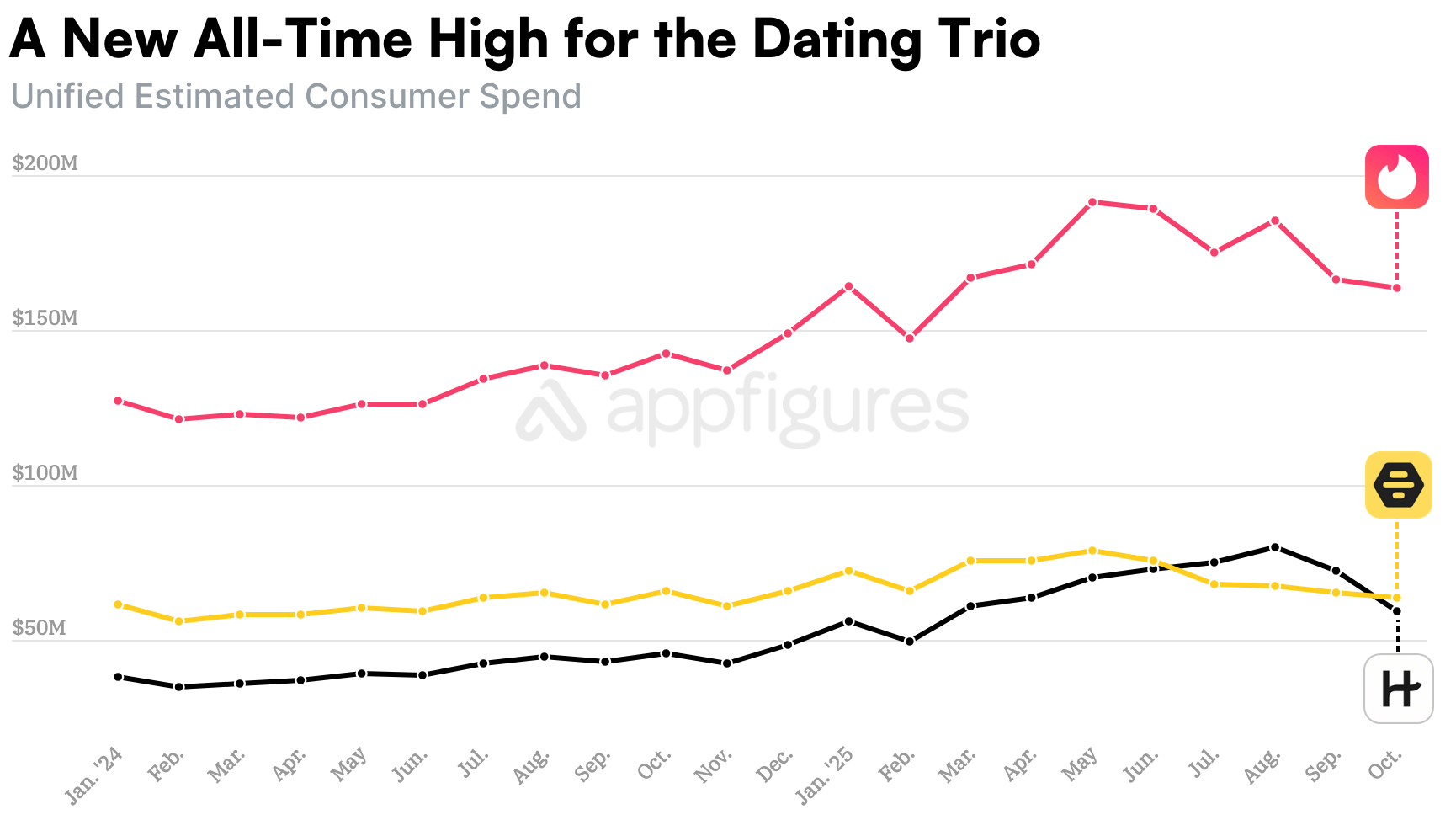 Hinge's push ended and its revenue dropped in October down a smidge below Bumble's - $41M vs. $44M before fees, according to Appfigures Intelligence.