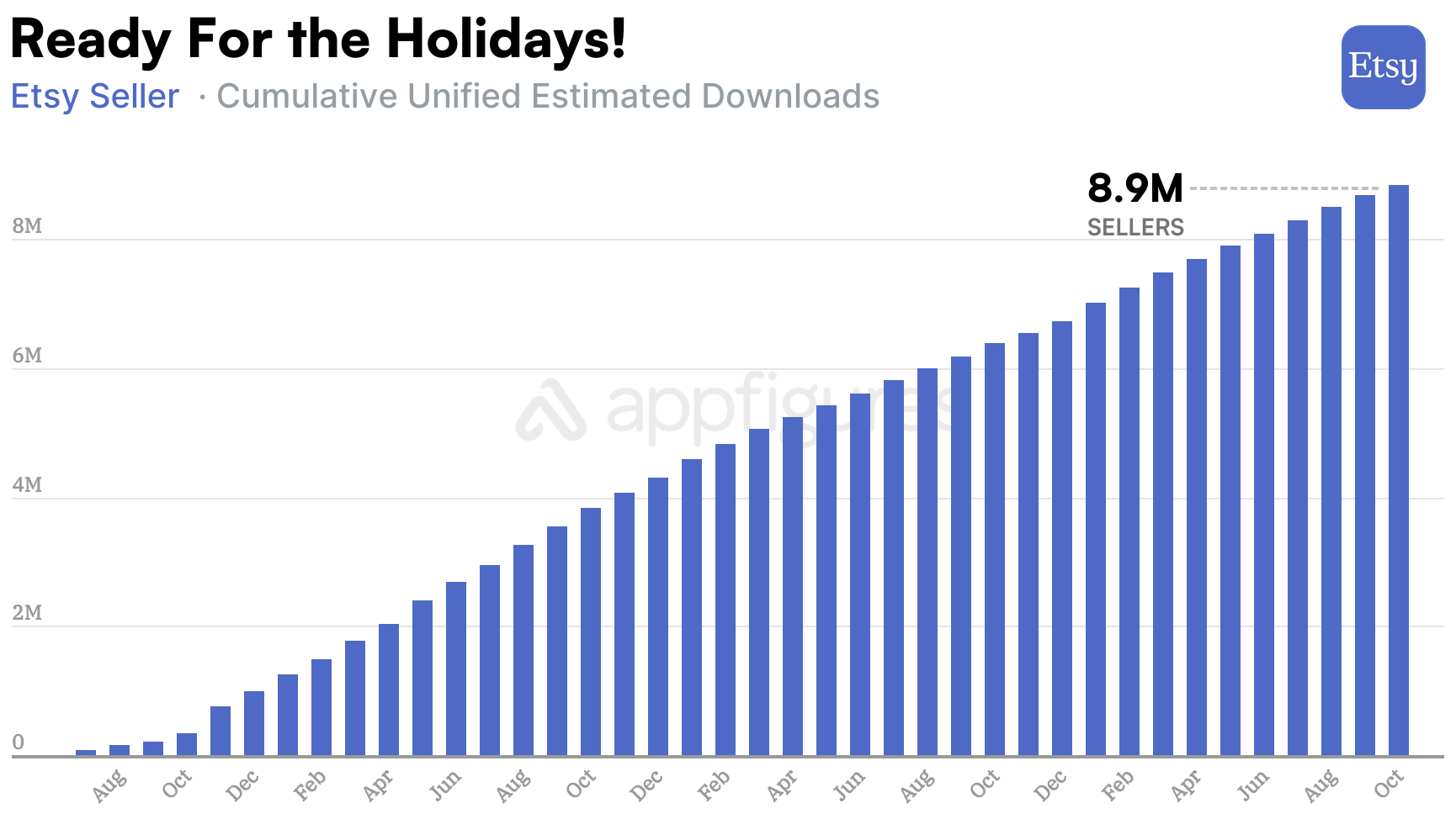 The app was released in the summer of 2022 and received a lot of downloads in the first few months, most likely from existing sellers. According to Appfigures Intelligence, Etsy Seller was downloaded 2.7M times in its first 12 months of availability.