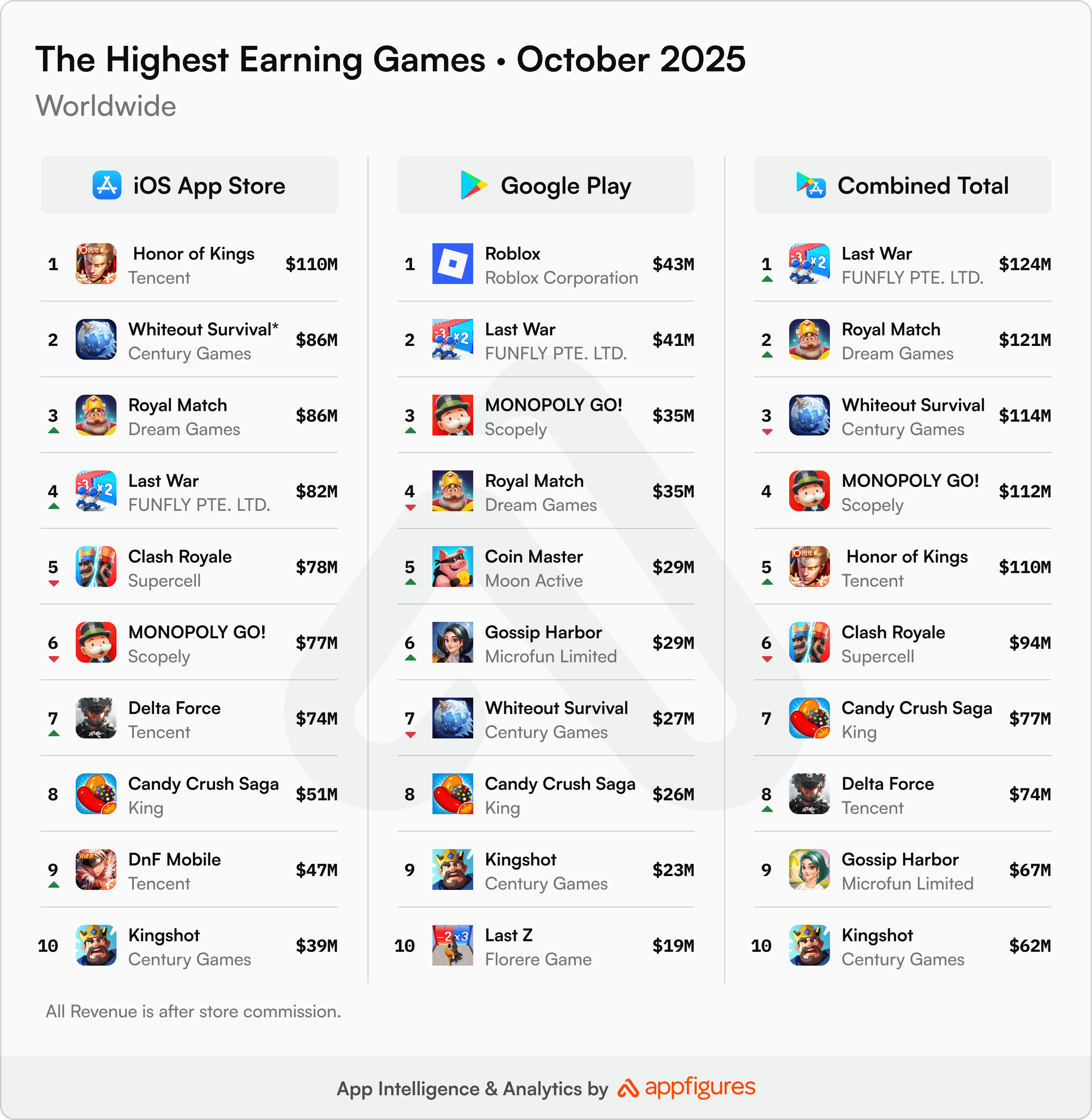 Whiteout Survival fell to #3 with $114M, and Monopoly GO! slipped one spot to #4 despite holding above the $110M mark. Tencentβs Honor of Kings completed the top five, driven largely by its iOS dominance in China.