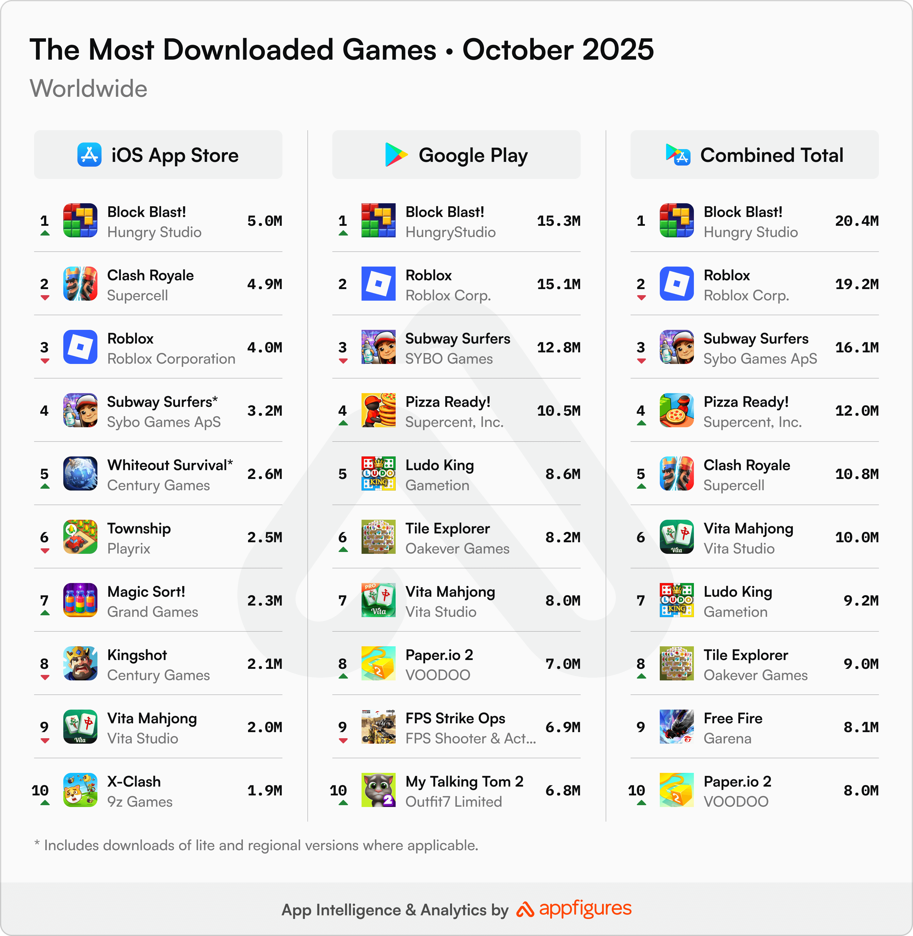 Altogether, the world's 10 most downloaded mobile games totaled 123M downloads in October, according to Appfigures Intelligence. A 9% increase month over month from September's haul. That bounce hints that the post-summer lull is fading and that familiar names are back to driving momentum as the holidays approach.
